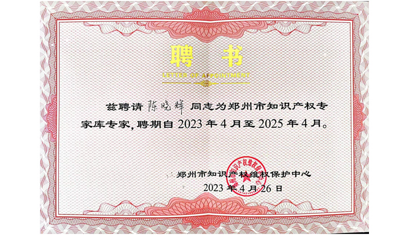 2023年4月鄭州睿信副總經理陳曉輝首聘為鄭州市知識產權專家庫專家。 -