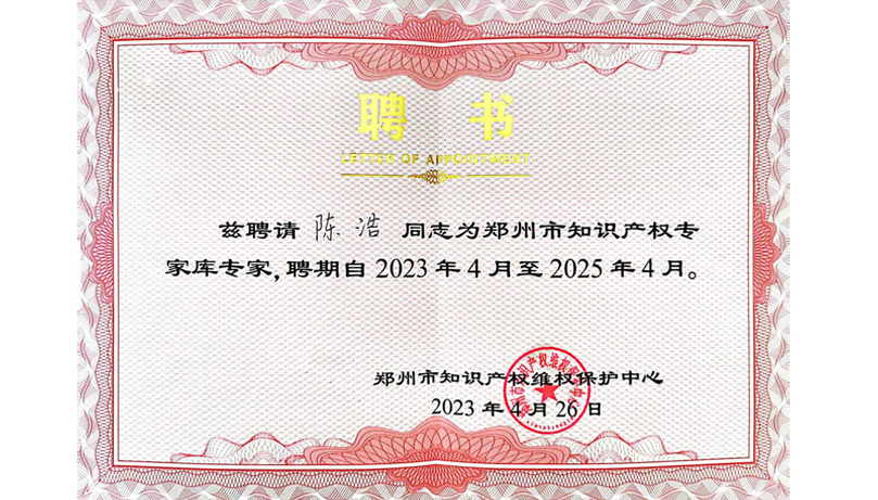 2021年11月公司總經理陳浩被河南省知識產權局聘為河南省專利侵權判定咨詢專家。